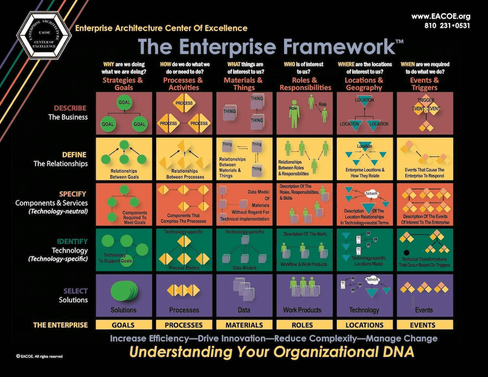 Based on the work of John Zachman and John Sowa from IBM and elaborations thereof, The Enterprise Framework™ leverages artifacts, diagrams, and abstractions widely recognized by business and technology professionals.